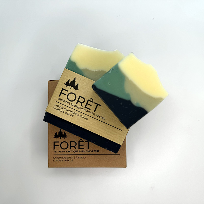 Savon saponifié à froid enrichi en argile verte et charbon végétal activé, au parfum frais et boisé d’huiles essentielles bio de verveine exotique et pin sylvestre. Idéal pour les peaux mixtes à grasses ou après le sport.