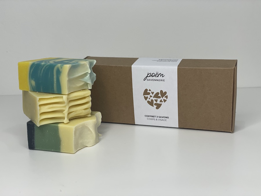 Coffrets de 3 savons différents : 1 savon Océan, 1 savon Forêt et 1 savon Avoine